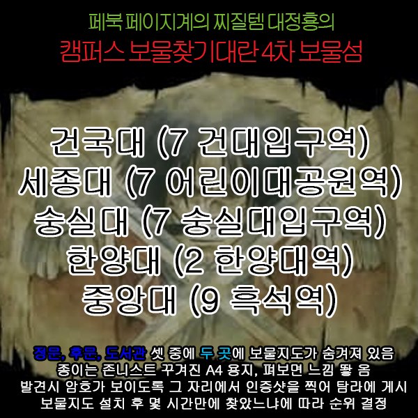 2. 보물지도 찾으신 분들은 최대한 빠른 시간 안에 대정횽 탐라에 인증샷ㄱㄱ 안보이는 경우도 있음. 혹시 모르니까 걱정되면 메세지 보내여. 귀찮음 말고.