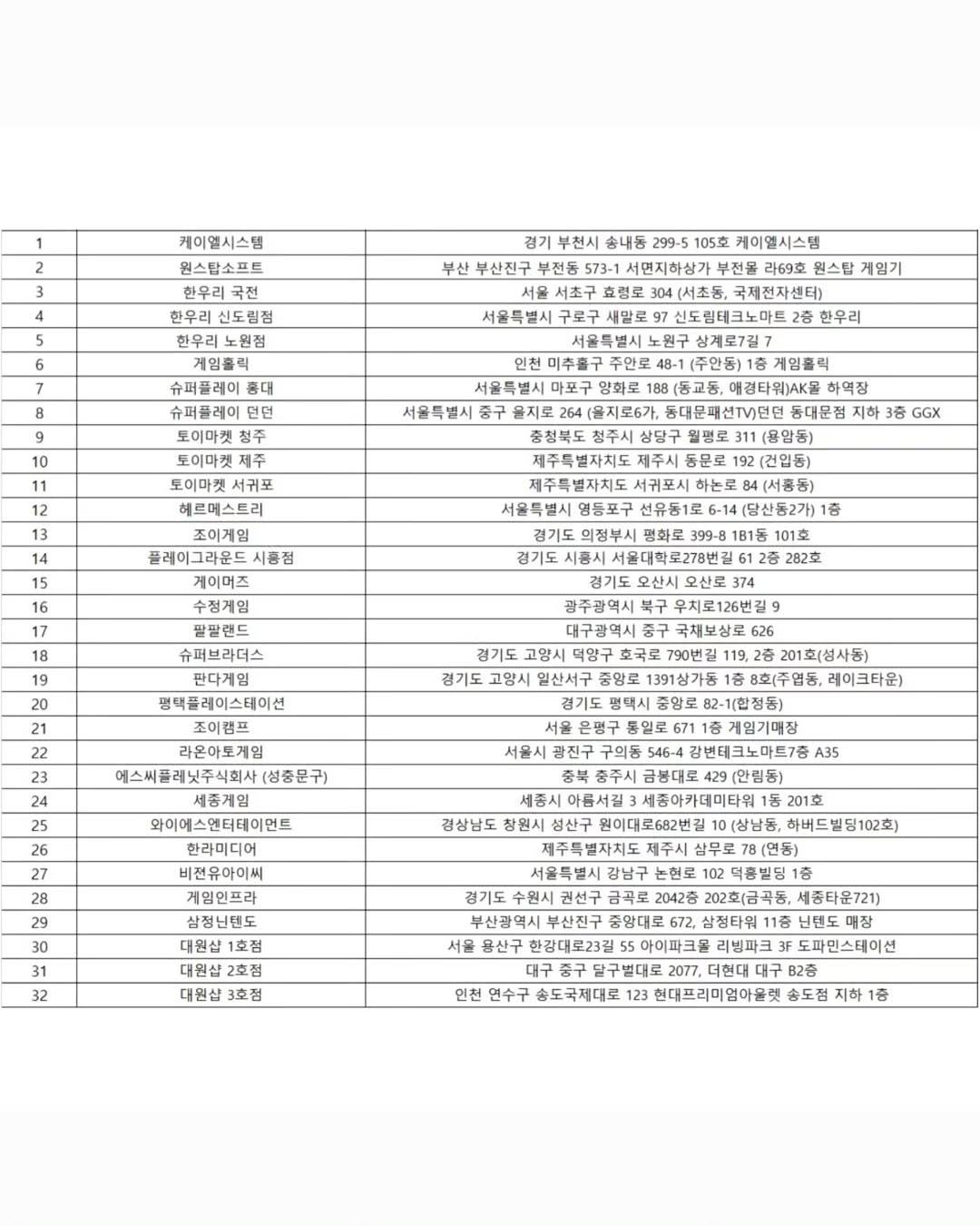 - 오프라인 대원샵(용산 아이파크몰, 더 현대 대구, 현대프리미엄아울렛 송도점) 외 전국 오프라인 게임전문점
